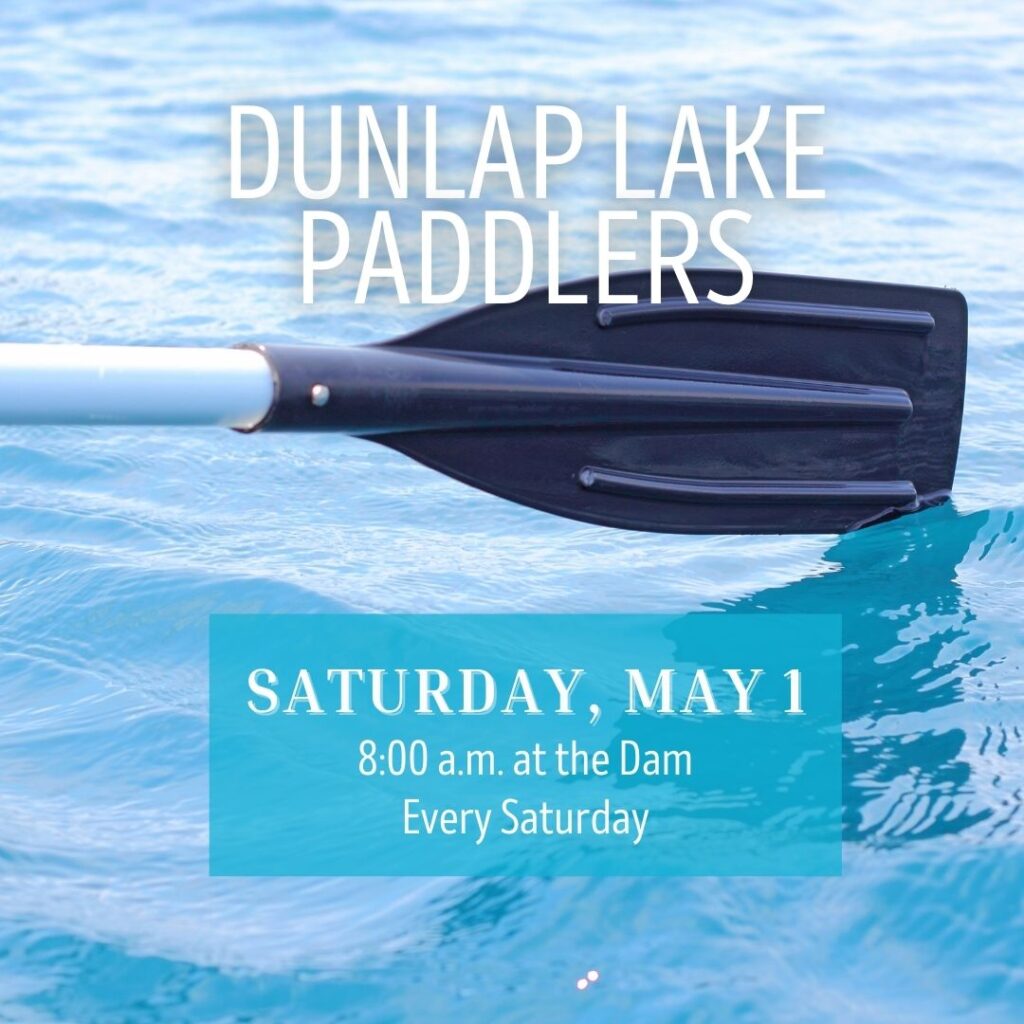 Join the Dunlap Lake Paddlers! Kayaks, canoes, and paddleboards are all welcome as we paddle the lake every Saturday at 8 AM through Labor Day weekend.
