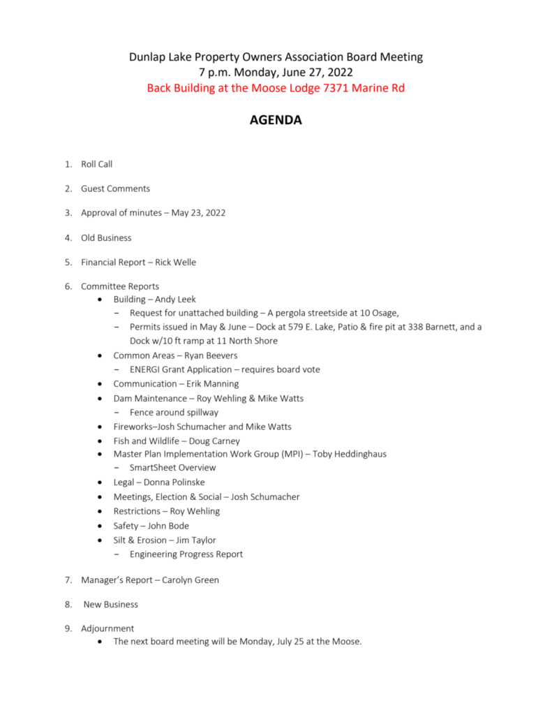 Board Meeting Agenda – June 27, 2022 at the Moose Lodge Jun 24, 2022 | HOA / Board The DLPOA board will meet on May 23, 2022, at 7 p.m. – at Edwardsville Moose Lodge (Back Building)