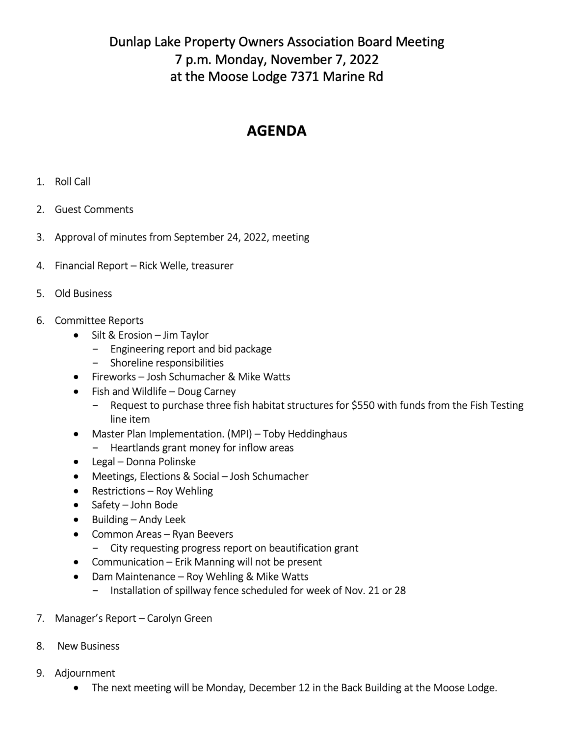 Board Meeting changed to 7 p.m. Mon. Nov. 7, 2022 Nov 4, 2022 | HOA / Board The DLPOA board normally meets at 7 p.m. the last Monday of the month at the Edwardsville Moose Lodge. The board will not meet on Halloween. They will meet at 7 p.m. Nov. 7 instead. There will also be meeting at 7 p.m. on Monday Dec. 12.