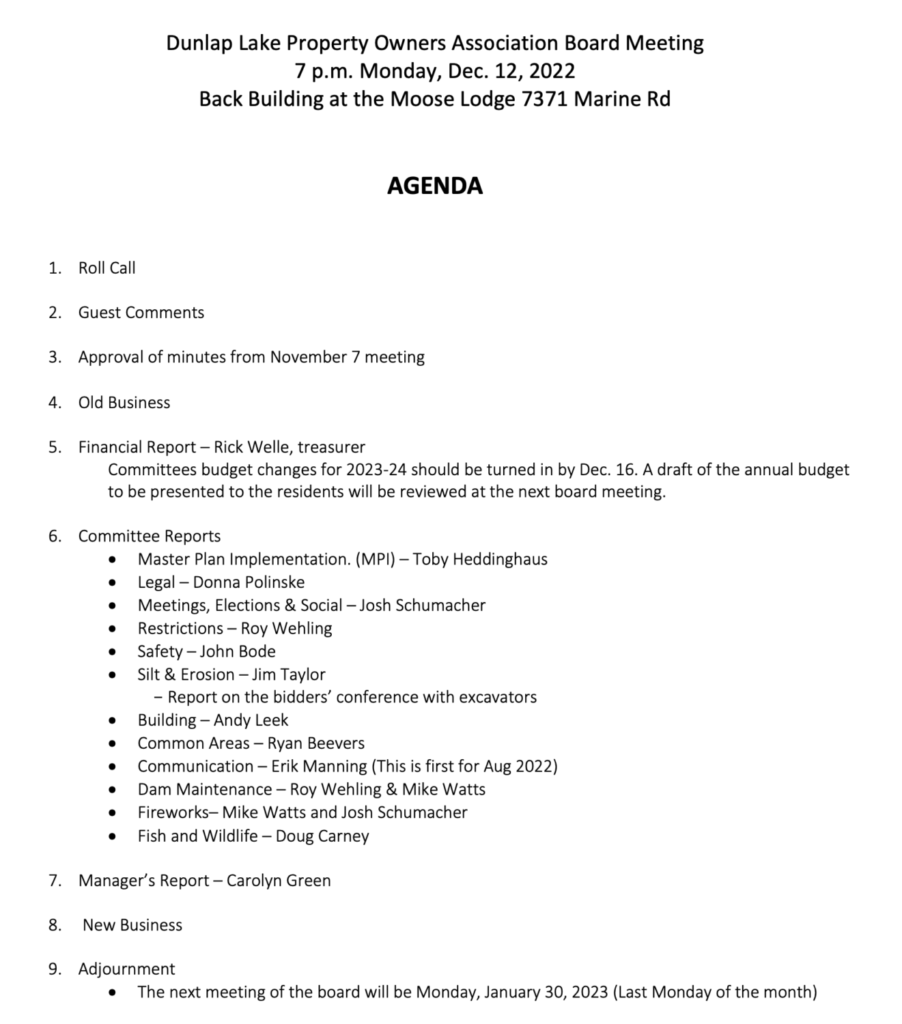 Board Meeting Agenda – 7 p.m. Dec. 12, 2022 Dec 10, 2022 | HOA / Board The DLPOA board meets at the Edwardsville Moose Lodge in the back building.