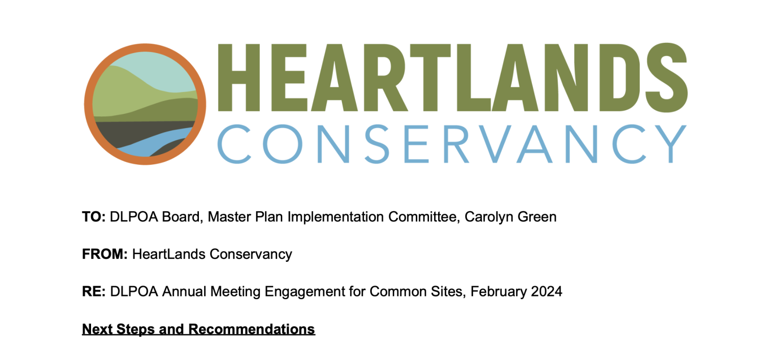 DLPOA Annual Meeting FeedbackThanks to everyone who gave input on commons area maintenance and improvements for the decade ahead. The master plan implementation committee now has a report from Heartlands Conservancy summarizing resident feedback and outlining best management practices that need to be observed to improve water quality.