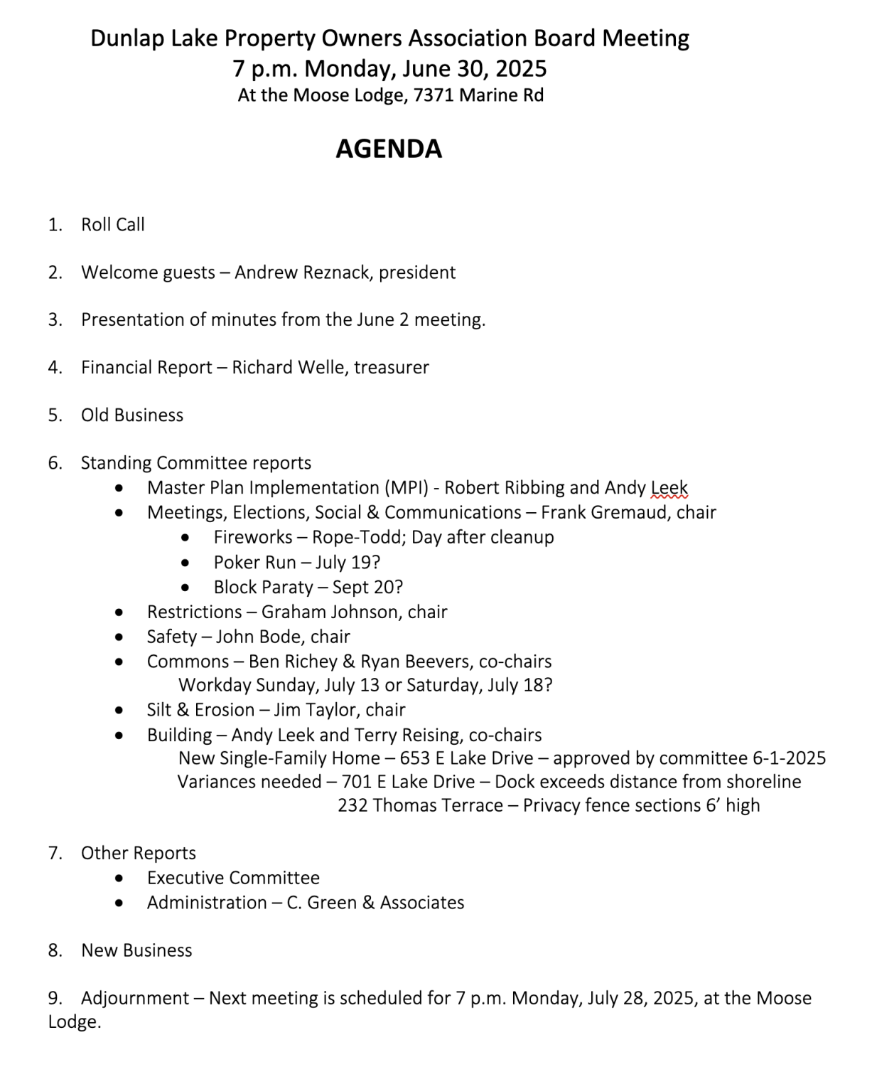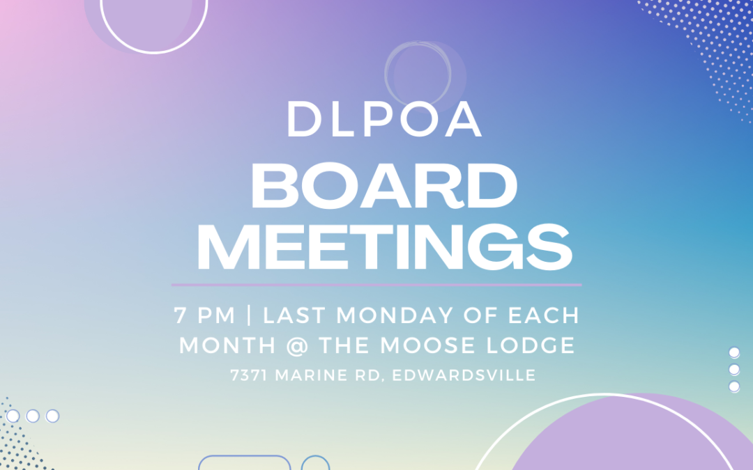 Dunlap Lake Board meetings are generally held at 7 p.m. the last Monday of the month at the Edwardsvillle Moose lodge. The June meeting will be held the 30th.