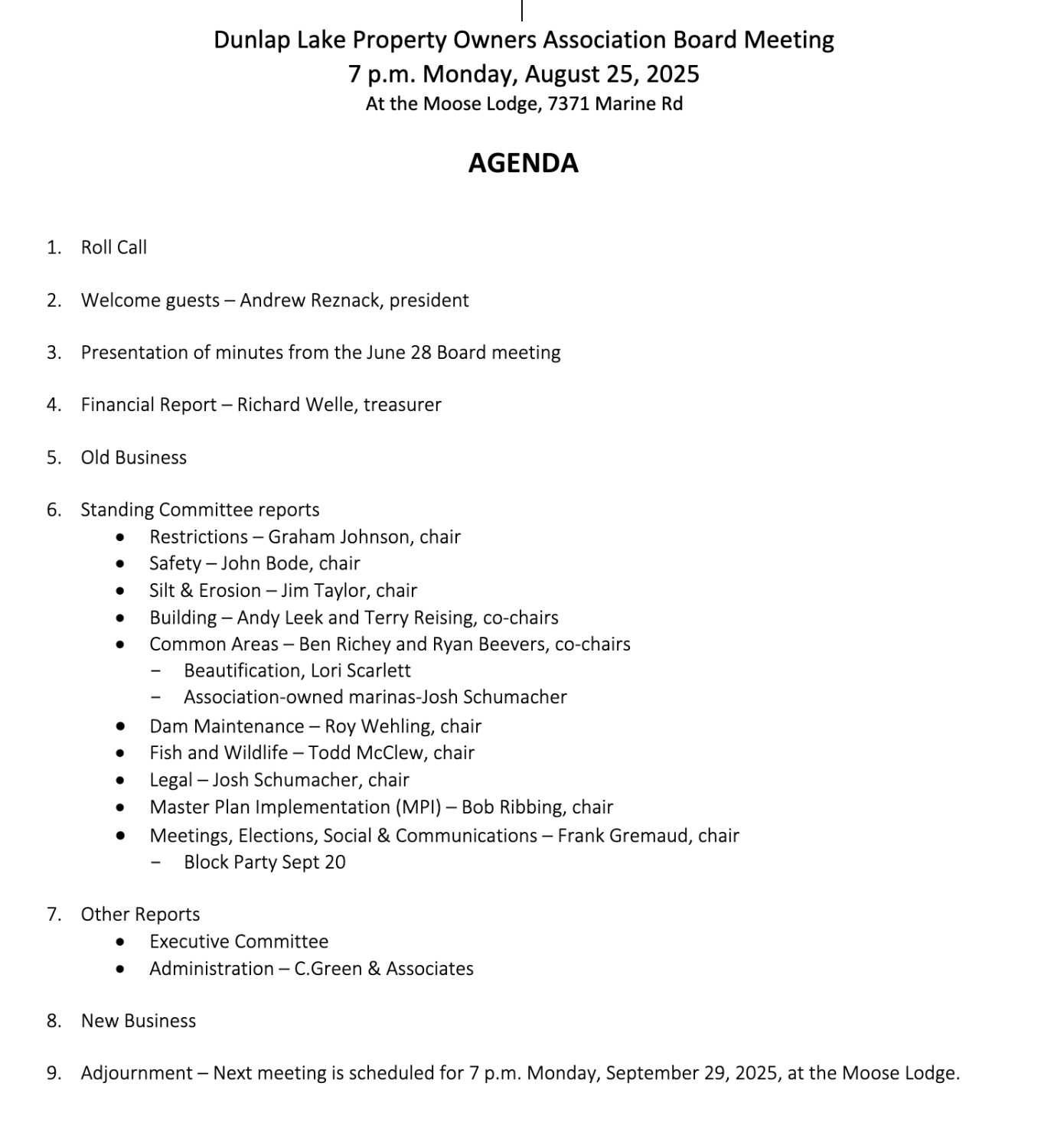 Dunlap Lake Board meetings are generally held at 7 p.m. the last Monday of the month at the Edwardsvillle Moose lodge. Residents are encouraged to be attend and be part of the decision making process. Agenda below.