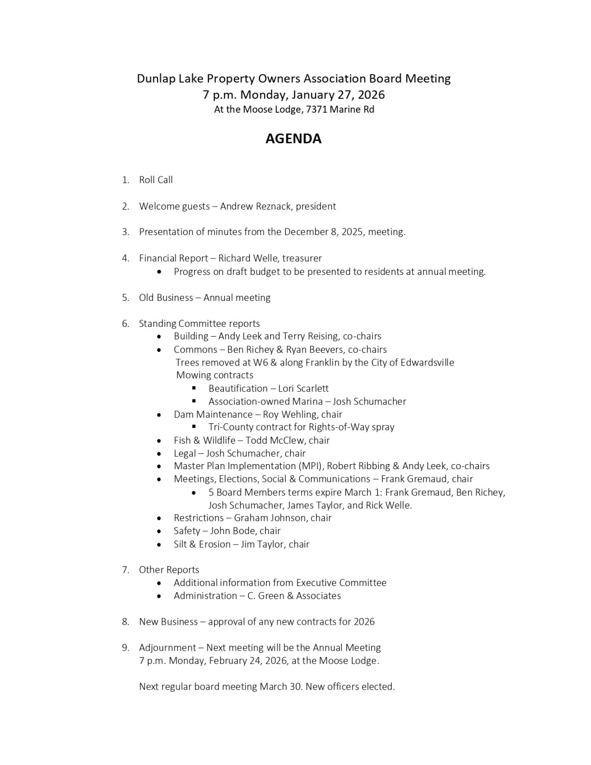 Because of snow, the Dunlap Lake Property Owners Association Board Meeting will be held at 7 p.m. on Monday, January 26, 2026, via zoom.