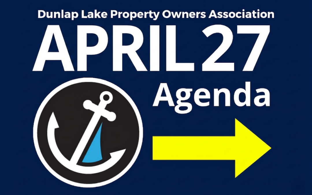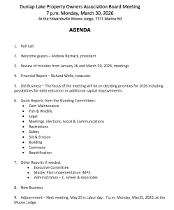 Dunlap Lake Board meetings are generally held at 7 p.m. the last Monday of the month at the Edwardsville Moose lodge. Residents are encouraged to be attend and be part of the decision making process. Here is the Agenda for the April. 27, 2026 meeting..